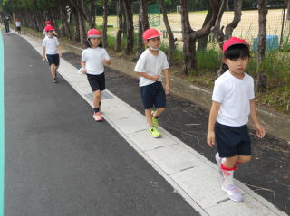 熱中症が心配なこれからの季節、マスクを外しても安心して登下校できるように、2m程度の距離を保って歩く練習を1年生がしました。約2mごとに付けた色テープを目印にしながら、おしゃべりをせずに上手に歩けていました。 ![]() ![]()