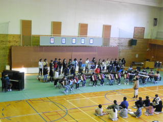 この日は土曜授業の日でした。本校は、中学校区でのコミュニティ・スクールを設置して、3校が合同で取組を行っていますが、その一環として、中学校区全体での避難訓練を実施しました。マグニチュード9クラスの巨大地震が発生したという想定で、屋上への避難が難しいという設定の中、高台にある木本中学校へ避難するというものです。児童は浮くっしょんを手に校庭に1次避難したあと、安全が確認された避難経路に従って木本中学校へ避難しました。中学校では、低学年と高学年に分かれて、中学生の指導の下、避難時運営シミュレーションや防災劇の鑑賞などの活動に取り組みました。