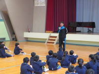 今日は全校集会がありました。はじめに学校長からは「挨拶」について、お互いが気持ちよく過ごすために、「一日の始まりのあいさつは心をこめて笑顔で行いましょう」という旨の話がありました。児童会からは、後期執行部が提案した生活目標の一つ「廊下は歩こう」について、みんなでこれまでの行動を振り返って考えてもらう時間をとりました。子どもたちからは「廊下を走ってしまった」「守っていない人がいる」などの意見が出されました。その後、執行部メンバーが発表した寸劇を通して、今後も生活目標「廊下は歩こう」をみんなで守り、誰もが気持ちよく過ごせる学校にしようと、再度の呼びかけがありました。