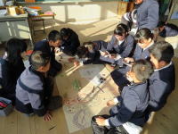 作品には自分たちの姿も入っていて、思い出がよみがえり、それぞれ修学旅行のエピソードを語り合うなど、作業中はとても楽しい雰囲気の中で作品制作が進んでいました。仕上がりがとても楽しみです。(この作品は来月10日、11日、本校講堂にて開催される「紀南子ども作品展」に出品される予定ですので、ぜひご覧になって下さい。)