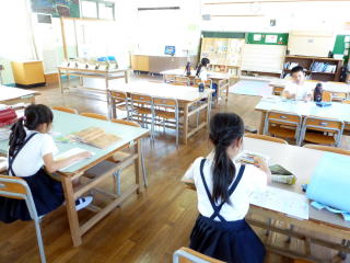 土曜授業日、4年生は図工の時間に紙粘土を使って身近にある小物づくりをしていました。制作中は指先を器用に使って、プチトマトや姫リンゴ、ギョウザやウインナー、マカロンなど本物そっくりに造ろうと、皆、集中して取り組んでいました。 「先生、見て、見て」「これ、かわいい」「うまそう」。友だちどうしで感想を出しあい合いながら、それぞれがイメージを膨らませていました。着色の方も指で行い、きれいに施された素敵な作品が次々とできあがっていました。