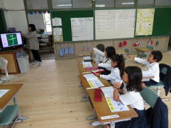 1年生は国語の時間、今日は新出漢字の書き取りや読みを覚えることをめあてとして授業が進んでいました。最初は画面に映し出された漢字の書き順をみんなで空書きして確認してから漢字ノートにある新出漢字を一語一語丁寧に書き込んでいました。書き取りの練習中は姿勢を正し、黙々と書くことに集中していました。