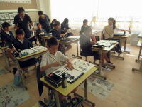 6年生は書写の時間、手本は「豊かな心」。一人ひとり、漢字の形や線の高さや方向、また書き順や点画に注意し、黙々と集中して作品を書きあげていました。