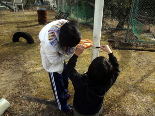 小学4,5年生は算数の時間、円の半径と円周率との関係を調べるために、校庭にある樹木や遊具などの柱をメジャーで測って、直径と円周率や円周の値を求めていました。