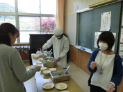 今日の給食は鶏の肉じゃがとごぼうサラダでした。山盛りのご飯や「おかわり」するなど、さすが中学生、食欲旺盛です。楽しい雰囲気で食事をしながらも、片手で食べるなどのマナー違反について先生に注意される場面もありました。